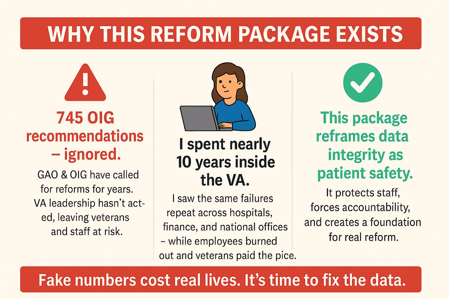 This page brings together the solutions Congress needs to act on now. The Veterans Data Integrity Reform Package (2025) is a set of bills designed to turn oversight findings into enforceable change. It reframes data integrity as patient safety, protects mission-critical roles, and ensures VA leaders are accountable when the numbers don’t match reality.